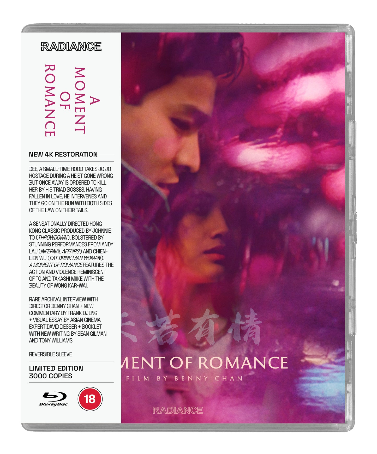 Small-time hood Wah Dee (Andy Lau, Infernal Affairs) is enlisted by Triad boss Trumpet (Tommy Wong, The Killer) as a getaway driver for a daring heist that goes wrong. Thinking fast Dee takes Jo Jo (Jacklyn Chien-Lien Wu, The Barefooted Kid) hostage to save his skin, but the bosses order her to be killed. They escape and begin a forbidden relationship while being chased by both sides of the law. Produced by Johnnie To (Throwdown) and Ringo Lam (City on Fire) the film is sensationally directed by Benny Chan in his feature debut. With a breakneck pace and violence reminiscent of To and Takashi Miike and the beautiful and emotive sensibility of Wong Kar-wai, the film features stunning performances from Lau, and Wu in her debut work. A Moment of Romance is a classic of Hong Kong cinema that has been much imitated but rarely bettered.
