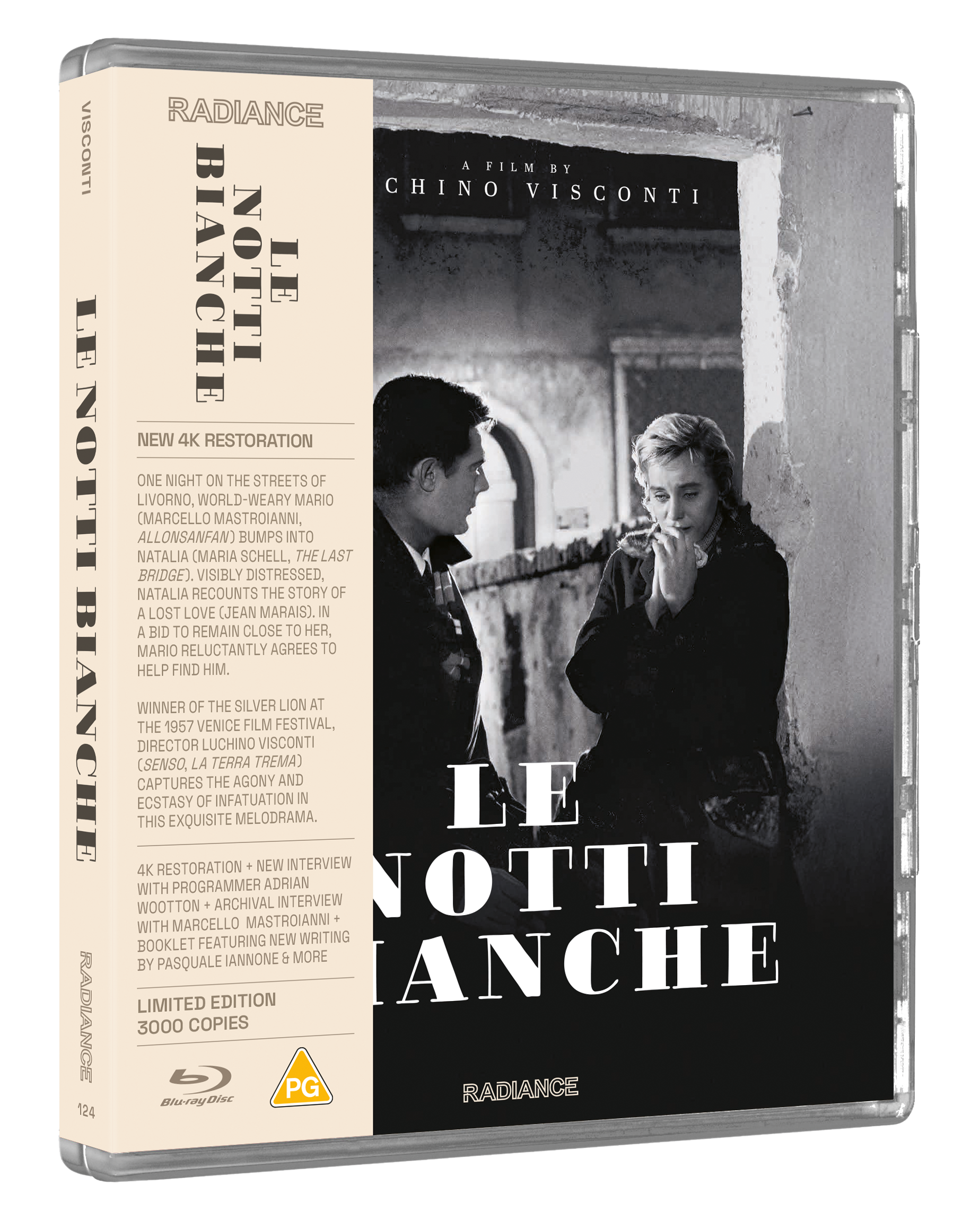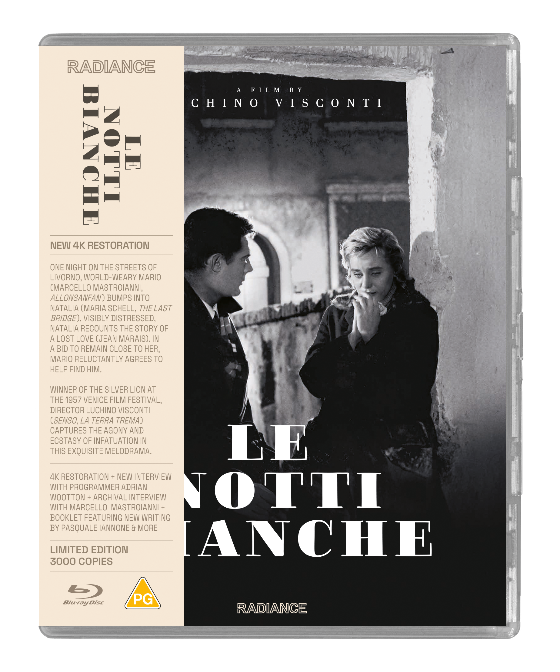 One fateful night on the streets of Livorno, world-weary Mario (Marcello Mastroianni, Allonsanfan) bumps into Natalia (Maria Schell, The Last Bridge), a visibly distressed young woman. As Mario attempts to comfort her, Natalia recounts the story of a lost love (Jean Marais) who she hears is back in town. In a bid to remain close to her, Mario reluctantly agrees to help Maria find him. Adapted from a Fyodor Dostoyevsky short story, director Luchino Visconti (Senso, La terra trema) captures the agony and ecstasy of infatuation in this exquisite melodrama. Headlined by two stellar performances from Marcello Mastroianni and Maria Schell, Le notti bianche won the Silver Lion at the 1957 Venice Film Festival.