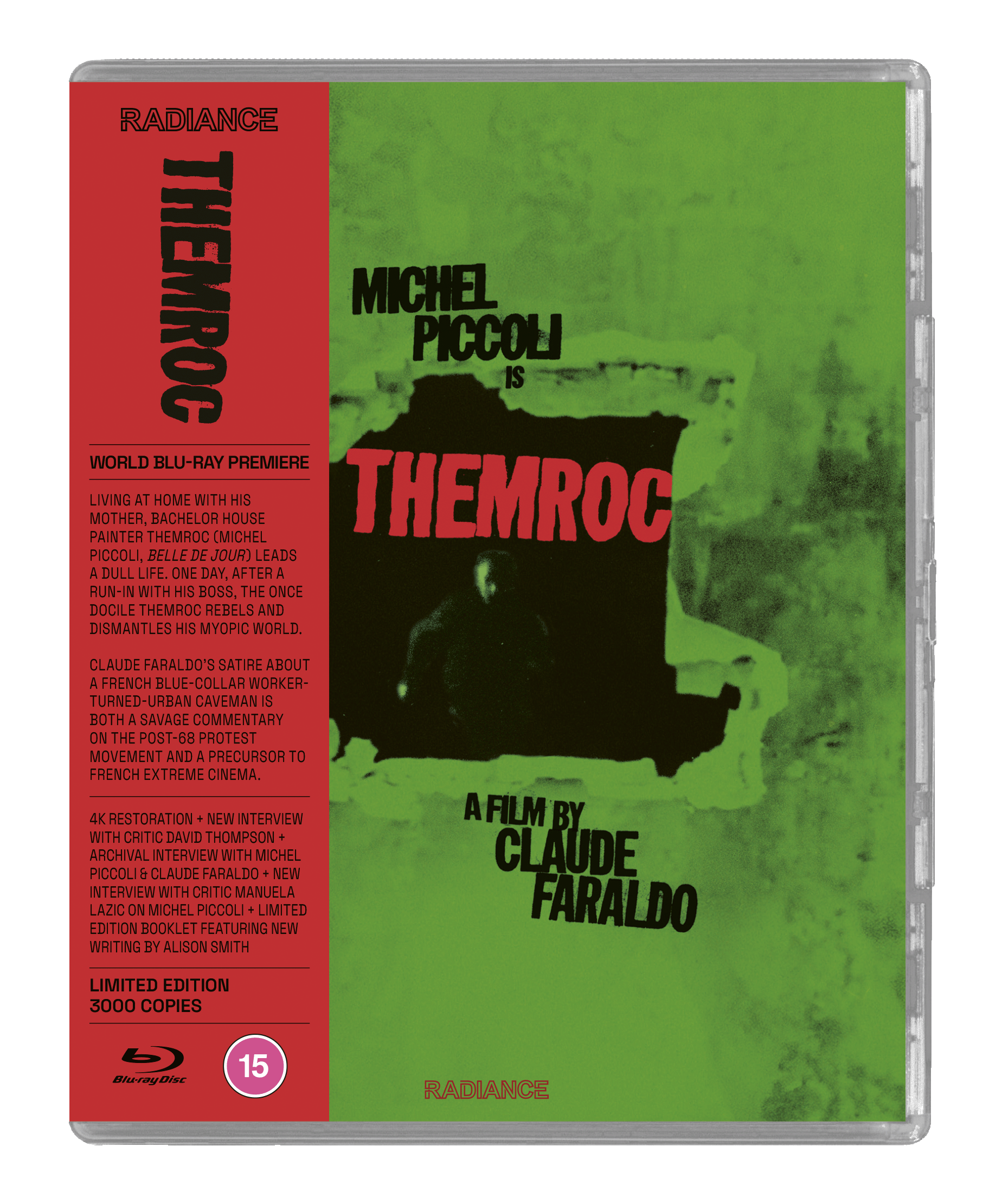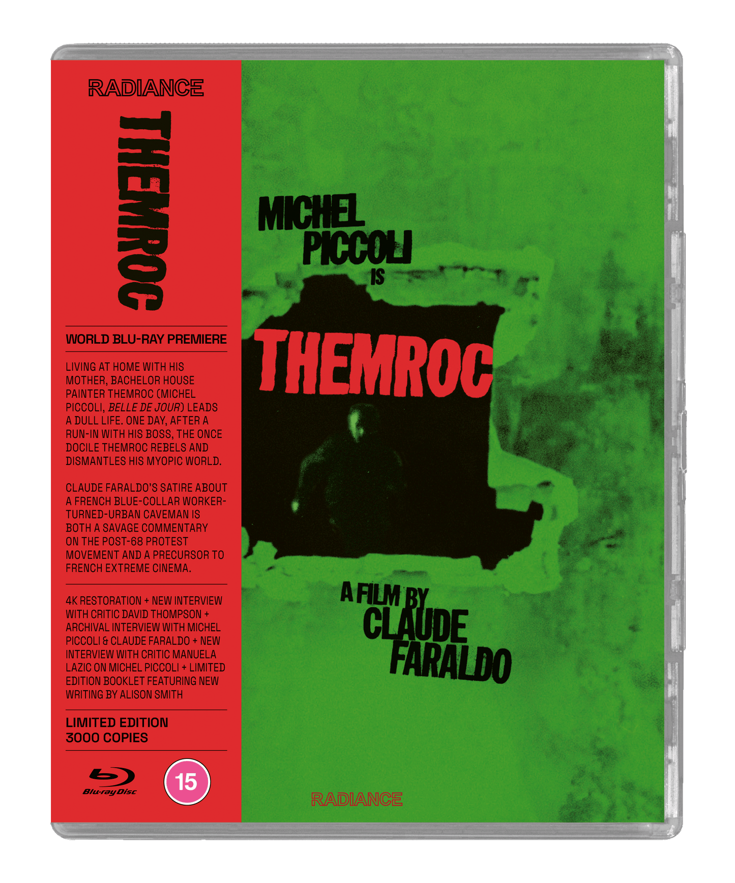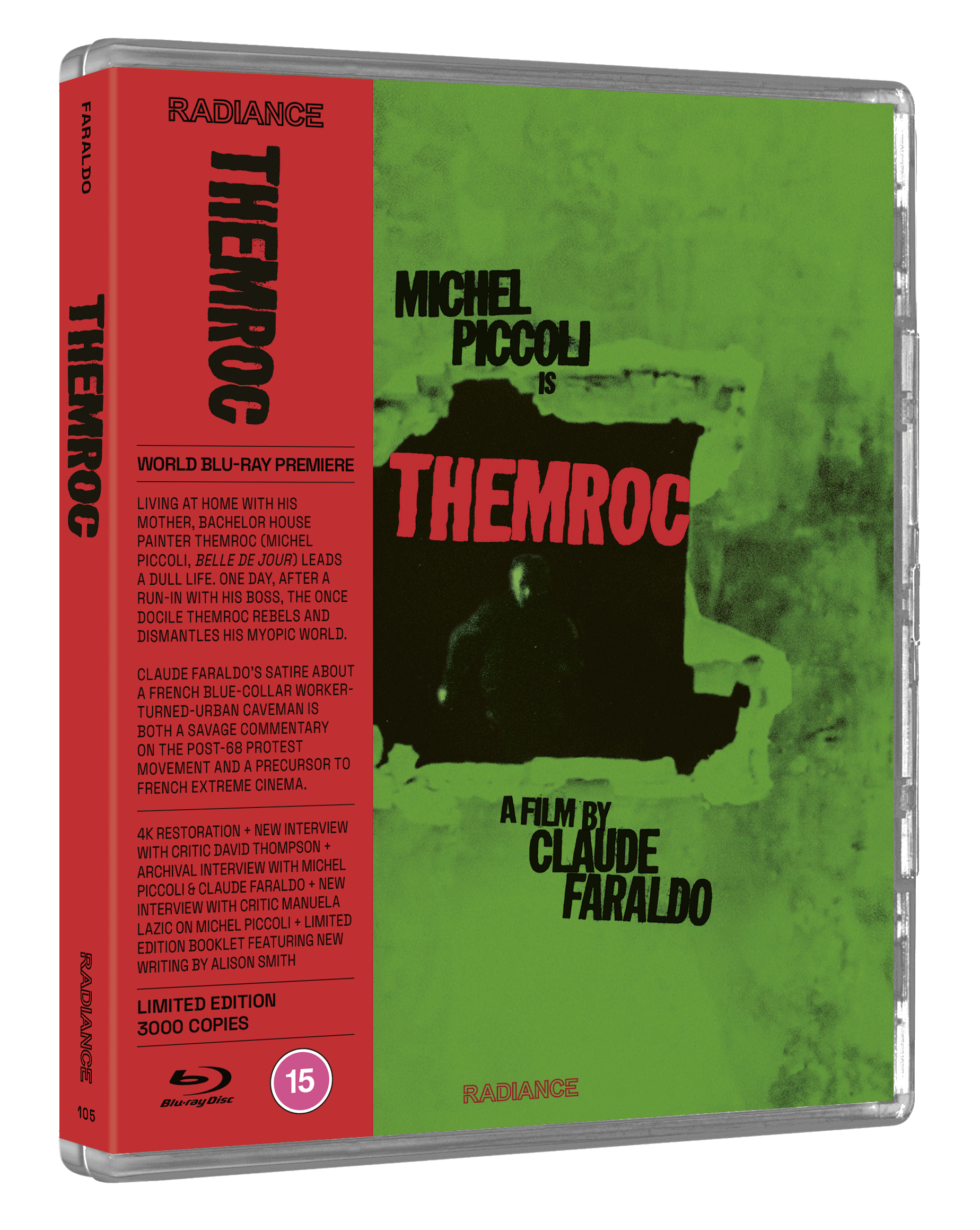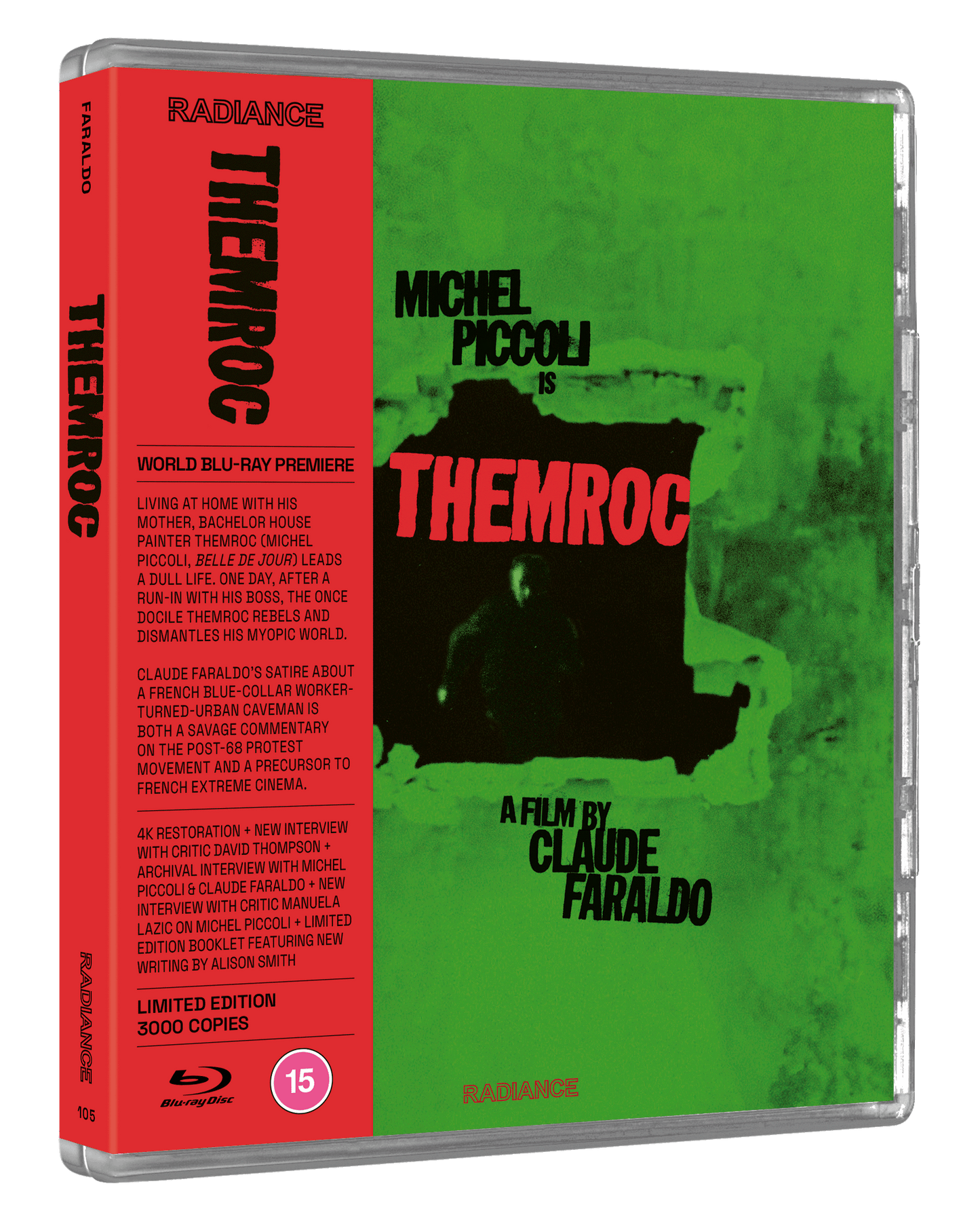 Living at home with his mother, bachelor house painter Themroc (Michel Piccoli, Belle de Jour) leads a dull life. One day, after an unearned run-in with his boss, the usually docile Themroc rebels and dismantles his myopic world. Made on a shoestring budget with no intelligible dialogue, Claude Faraldo’s cult taboo-busting satire about a French blue-collar worker-turned-urban caveman anarchically eviscerates mid-century labour and gender politics. Never released on disc in the UK, Themroc may be familiar to British audiences from Channel 4's infamous Red Triangle showings, intended for adults only; now this savage satire can be seen again, newly presented on Blu-ray from a 4K restoration.